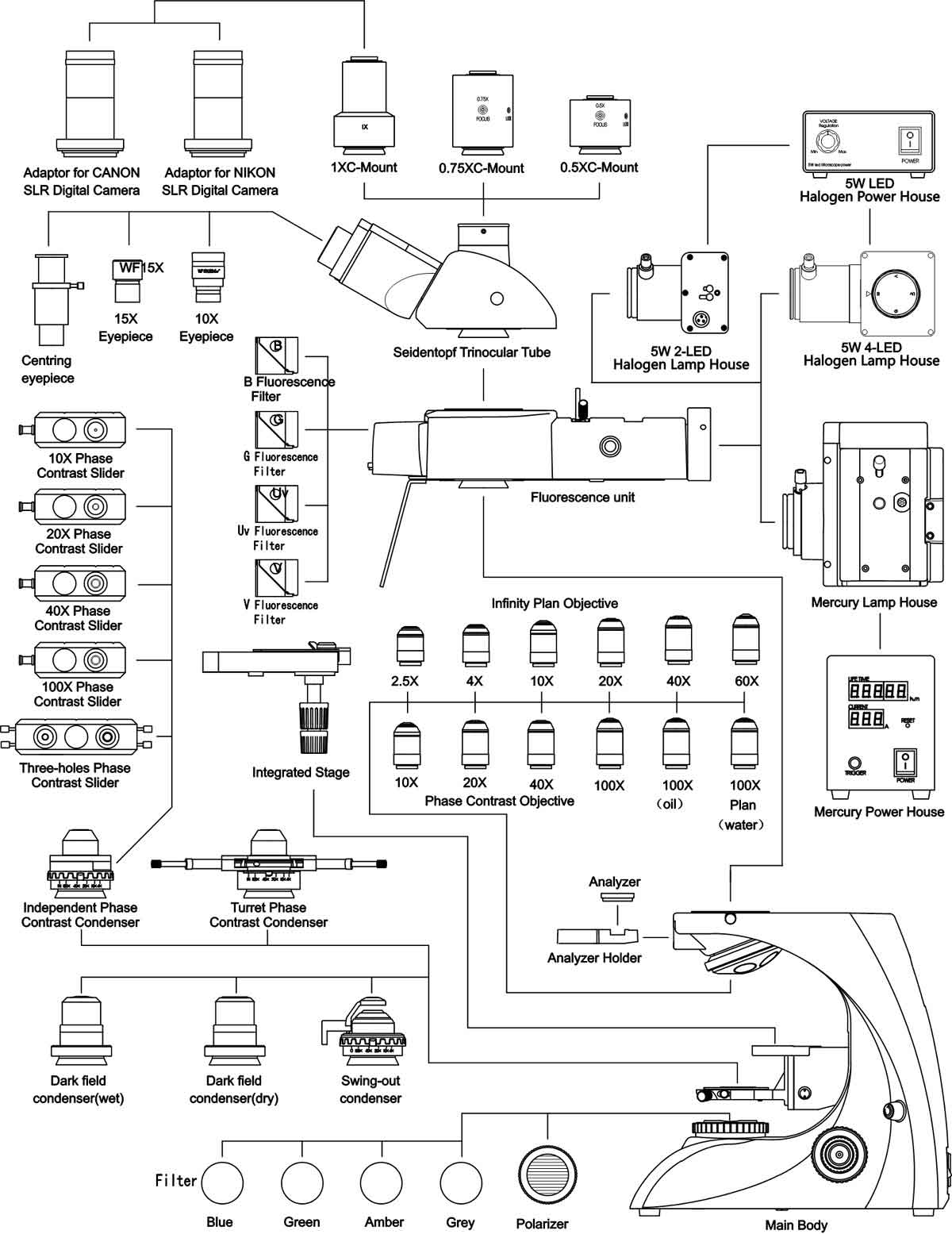 Fluorescence AttachmentEpi fluorescence unit ( six-hole disc media which can be fixed with Uv /V/B/G and another filters) ,100W mercury lamp.