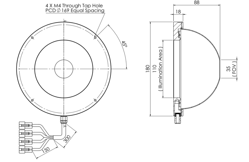 V2DM-Si150-4 is a Dome Light designed for machine vision application to give a very bright diffused omni-directional light to create a uniformed shadow-free illumination area . It has an external Diameter of 180 mm and opening Diameter of 35 mm, an illumination area of 110 mm in diameter. It comes in 3 spectrum Green, Blue and White. V2DM-Si150-4 provide a super bright lighting, avoid stare at exposured lighting when operation. Useful for application where needs to be visible in long distance, recommended to use as strobe lighting to perform high brightness lighting with longer life span.