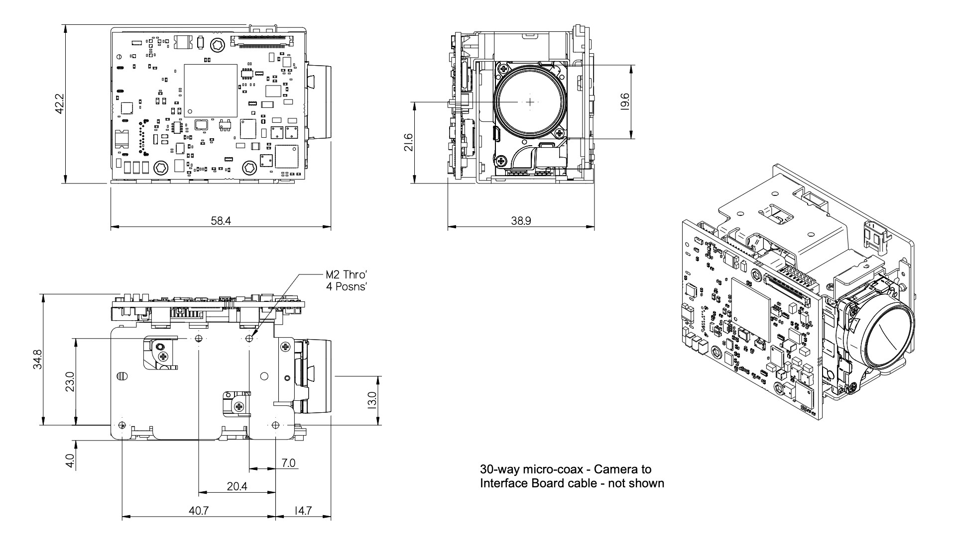 | KEL30 Connector (J1) | The interface board is fitted with a 30-way miniature connector to link to the matching connector on the camera. Connector type: KEL USL00-30L. Mating cable: A 100mm 30-way micro coaxial cable (AS-CIB-USL30-100MM) is supplied with the camera. Different lengths are available. |