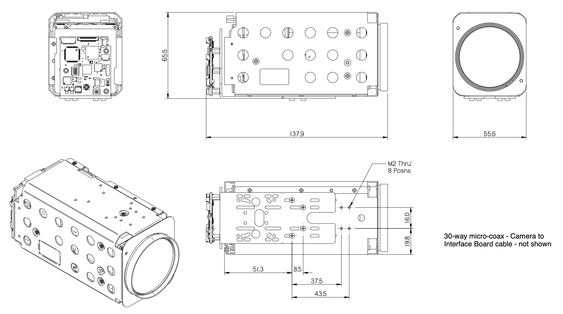| KEL30 Connector (J1) | The interface board on the camera is fitted with a 30-way miniature connector to link to the video output connector on the camera. Connector type: KEL USL00-30L. Mating cable: A 30-way micro coaxial cable (AS-CIB-USL30-100MM) is supplied with the camera. Lengths available: KEL USL20-30SS-010-C (100mm length) or KEL USL20-30SS-005-C (50mm length). |