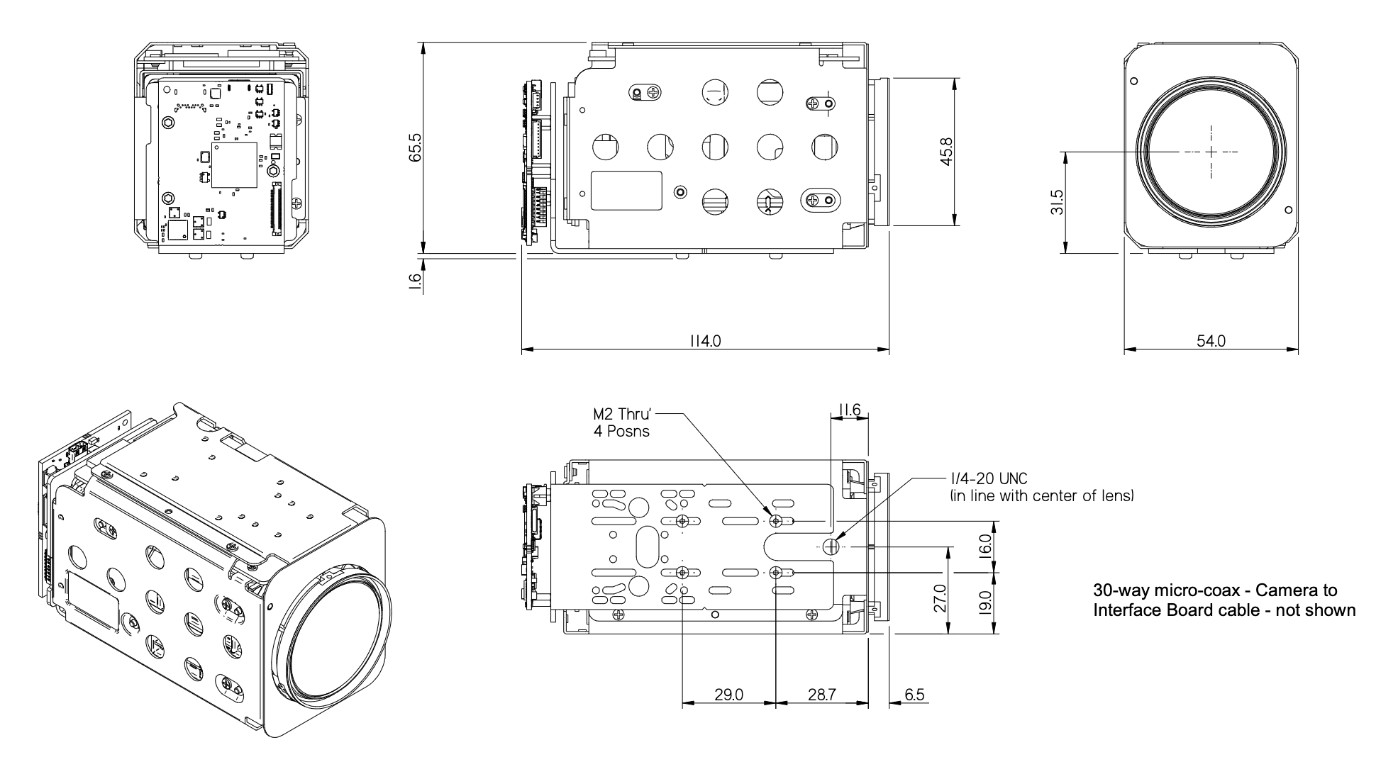 | KEL30 Connector (J1) | The interface board is fitted with a 30-way miniature connector to link to the video output connector on the camera. Connector type: KEL USL00-30L. Mating cable: A 30-way micro coaxial cable (AS-CIB-USL30-100MM) is supplied with the camera. Lengths available: KEL USL20-30SS-010-C (100mm length) or KEL USL20-30SS-005-C (50mm length). |