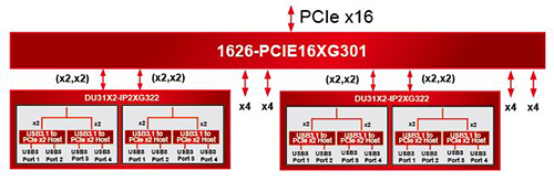 Utilizing the standard PCI Express Switch, the 48-Lane/13-Port PCI Express Switch provides the most efficient fan-out solution for integrating Eight PCI Express to USB 3.1 Single Chip Host controllers into a small board design. Each USB 3.1 to PCI Express Single Chip Host controller takes advantages of 10 Gbps burst rate of 2-lane PCI Express bus in both directions and is fully compliant with PCI Express Base specification r3.0. This solution provides full PCI Express and USB 3.1 functionality and performance.