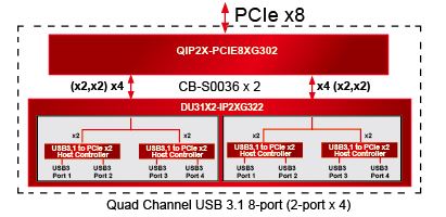 Utilizing the standard PCI Express Switch, the 16-Lane/5-Port PCI Express Switch provides the most efficient fan-out solution for integrating Quad PCI Express to USB 3.1 Single Chip Host controllers into a small board design. Each USB 3.1 to PCI Express Single Chip Host controller takes advantages of 10 Gbps burst rate of 8-lane PCI Express bus in both directions and is fully compliant with PCI Express Base specification r3.0. This solution provides full PCI Express and USB 3.1 functionality and performance.